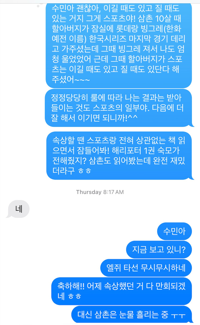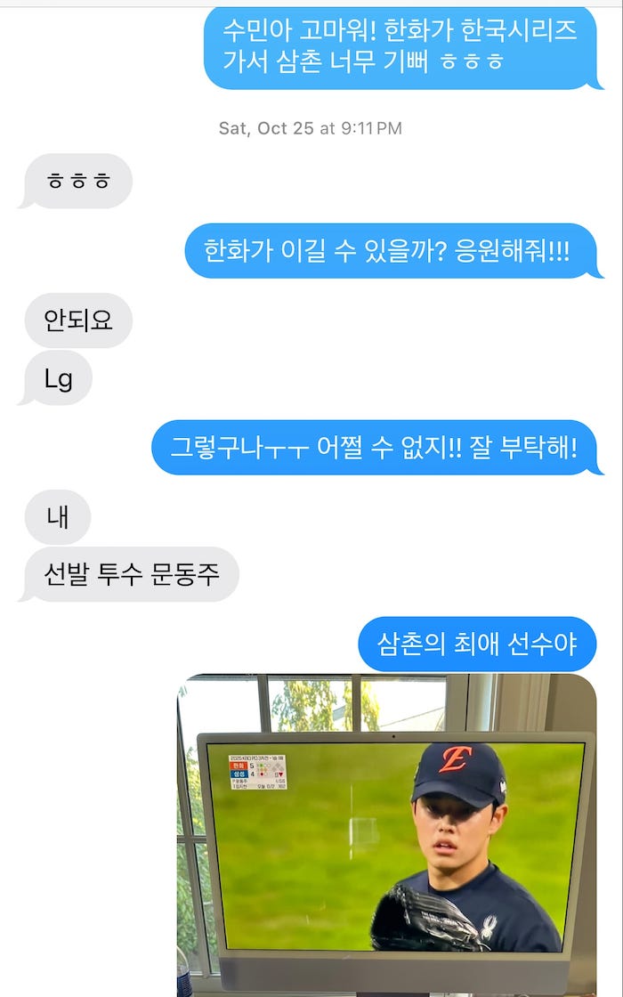 그런데 한화가 유일하게 승리한 한국시리즈 3차전이 끝나고 나서 동생한테 카톡이 왔습니다. “애가 아까 역전당할 때부터 엉엉 울고불고 난리네…” 스포츠를 별로 안 좋아하는 동생은 이해가 안 됐을 겁니다. 어렸을 적 제 모습을 보는 것 같아서 웃음이 났습니다.