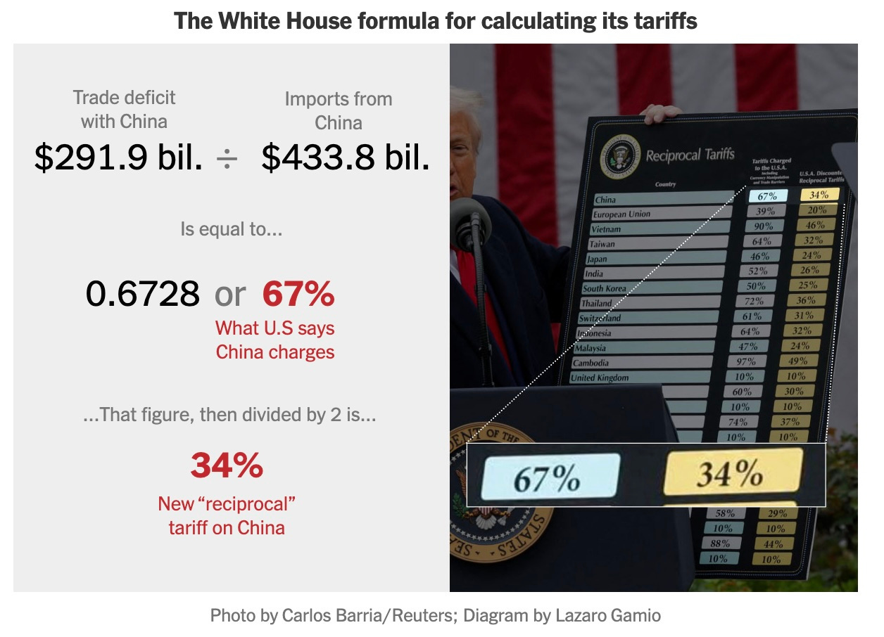 예를 들어 중국은 트럼프 대통령 첫 번째 임기 때 미국과 한바탕 관세 전쟁을 벌였고, 바이든 행정부도 이를 그대로 둬서 서로 관세가 남아 있다. 하지만 그 비율이 67%나 됐던가? 그리고 정말 67% 관세를 매기고 있다면, “이에는 이, 눈에는 눈”이란 상호 관세 원칙에 따라 똑같이 67%를 매겨야지, 갑자기 “나는 관대하다” 모드로 절반을 깎아주는 너그러움을 보여주는 건 뭐지? (실제 중국이 미국에 매기고 있는 관세율은 23%다.)